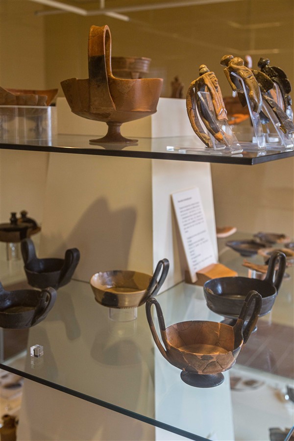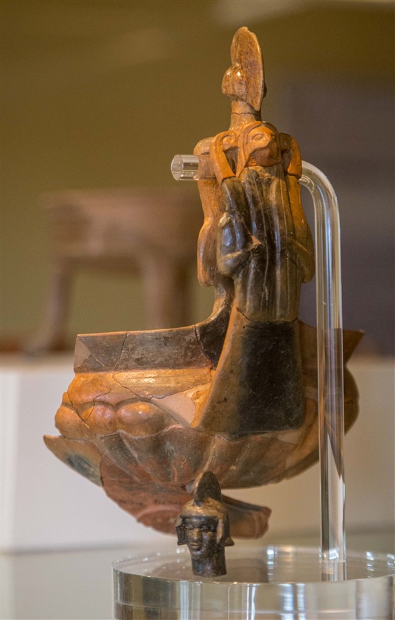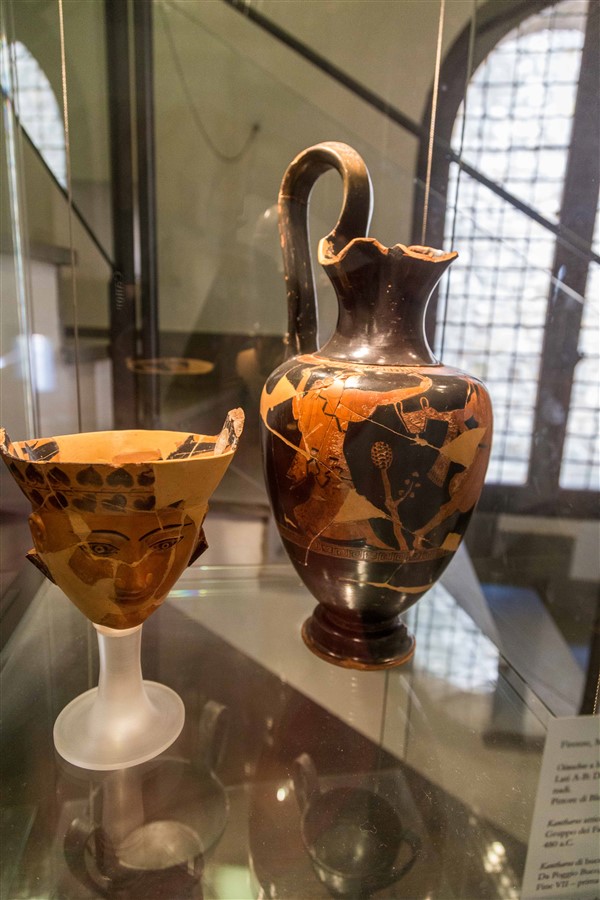 Etruscan advanced trade networks not only covered the Mediterranean but extended into northern and eastern Europe, and the Aegean. Etruscan artifacts have been found as far north as Sweden and as far east as South Russia. Exports included wine, olive oil, grain, pine nuts, wood, marble, copper, iron ingots, bronze ware, linen, pottery and fine jewelry. Imports included gold, ivory, ostrich eggs (which were decorated and exported), scarabs from Egypt, fine furniture, glass bottles, oil lamps, and pottery, especially fine Greek pottery from Attica, the southernmost peninsula of Greece that includes Athens and its countryside. This latter import was so popular that some were made especially to suit Etruscan taste. More Attic pottery has been unearthed in what was once Etruria than in all of Greece. The Etruscans made and exported their own unique earthenware pottery called bucchero. It was black and often highly polished (reminding me of the famous Maria Martinez pottery from San Ildefonso Pueblo just up the road from me). The styles and decoration of this and other red clay pottery evolved over time as the Etruscan and Greek ceramicists influenced each other.